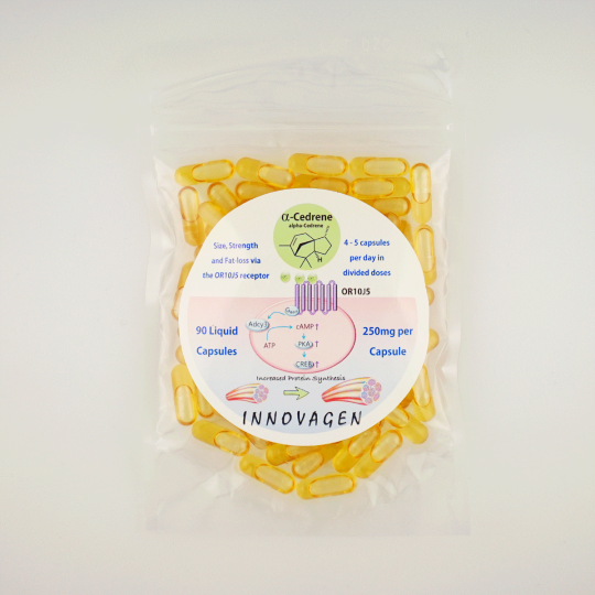 Alpha-Cedrene functions as a potent agonist of Olfactory Receptors (ORs), leading to significant increases in cAMP levels in muscle and fat cells. It is included at an effective dosage to enhance skeletal muscle mass and strength by promoting muscle protein synthesis while also exhibiting anti-catabolic and lipotropic properties. It is, essentially, an alternative to the majority of synthetic androgens.
